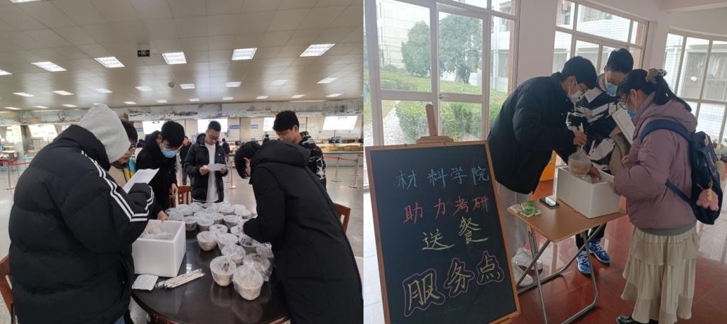 基础保障,前程无忧。为了解决考研期间自习教室少、休息时间短的问题,材料学院设立考研自习室三间,于12月24-27日间为考研学子开放;同时,招募学生党员组建立“助力考研送餐队伍”,提前了解考研学生用餐需求,并为其购买配送至宿舍楼下,极大的节约学生用餐等待时间,令考研学子在考试期间安心考试,有效休息。