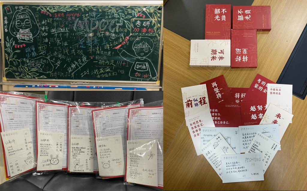 加油助威,怀爱前行。12月10日后,材料学院为考研学子制作考研加油栏,在加油栏中鼓励学子写下个人的焦虑、拼搏和奋斗誓言;学院师生用文字和Q版的绘画精心设计和制作考研加油贺卡,为缓解考生考前焦虑情绪,增强备考信心;制作考研加油视频,联动师生家长,共同为学子摇旗呐喊,送上最诚挚的祝福。