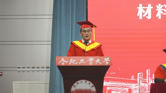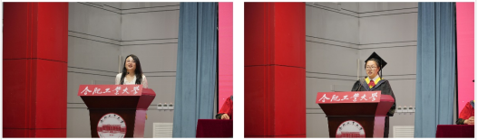 学院教师代表、金属材料工程系黄俊老师代表学院全体教师为毕业生送上真挚祝福,希望同学们能在强国筑梦的道路上践行“厚德、笃学,崇实、尚新”的工大精神,让青春在实现中华民族伟大复兴的征途中绽放绚丽光彩。安徽省优秀毕业生、“校长奖”获得者、2020级金属材料工程专业的姚文萱作为学位获得者代表发言,向大学期间所有提供关心、帮助和包容的师长、亲友和同学们致以最真挚的感谢,她表示将铭记母校的殷殷嘱托,奋楫笃行、敢为人先,争做德才兼备、能力卓越、自觉服务国家的骨干和领军人才。