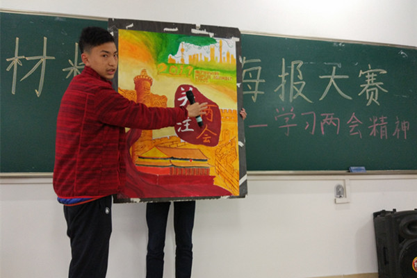 该院2016级各班团支部在查阅、学习两会相关资料的基础上,将自己心中的“两会蓝图”描绘成一幅幅生动的海报。活动现场,各班代表用精彩的语言,从海报的构思和绘制过程入手,讲解了自己对两会热点时事的认识与看法。各班的海报都立意鲜明,题材新颖,色彩绚丽,大家用自己的画笔表达了当代大学生对国家政治事件关心以及时政问题的看法和独到的见解。经打分评比,材料物理2016-1班荣获一等奖,金属材料工程16-2班和材料成型及控制工程16-3班荣获二等奖,粉体材料科学与工程16-1班、金属材料工程16-1班和无机非金属材料工程荣获三等奖。