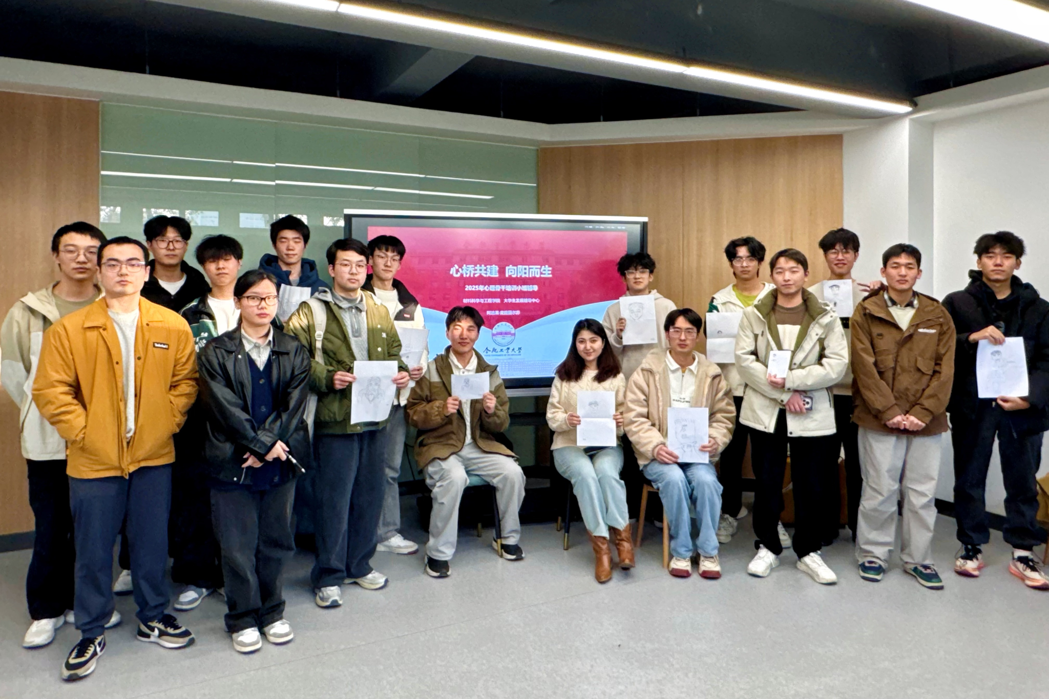 本次培训的第二阶段特别设计了“互绘肖像”团体互动环节,由学生骨干宋卓航同学主持。同学们围坐一圈,手持纸笔,通过细致观察,为对面的同学描绘画像。在作品展示与竞猜过程中,同学们以真诚的表达和积极的反馈,促进了团队情绪的积极流动,营造出温暖包容的集体氛围。